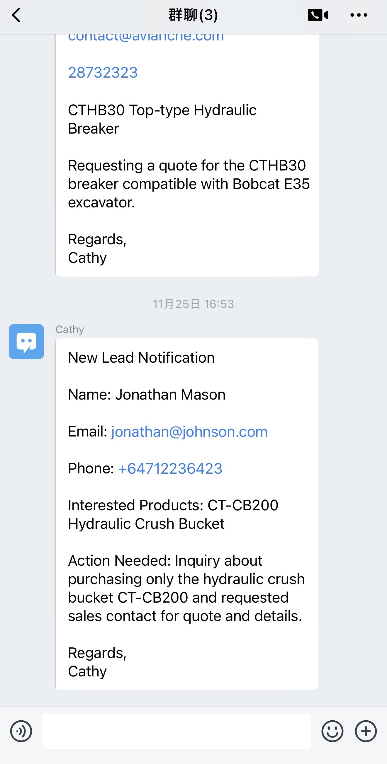 当客户提出报价或采购需求时,AI 会立即将核心信息推送到企业微信,让业务团队第一时间知晓、跟进,不错过任何成交机会。