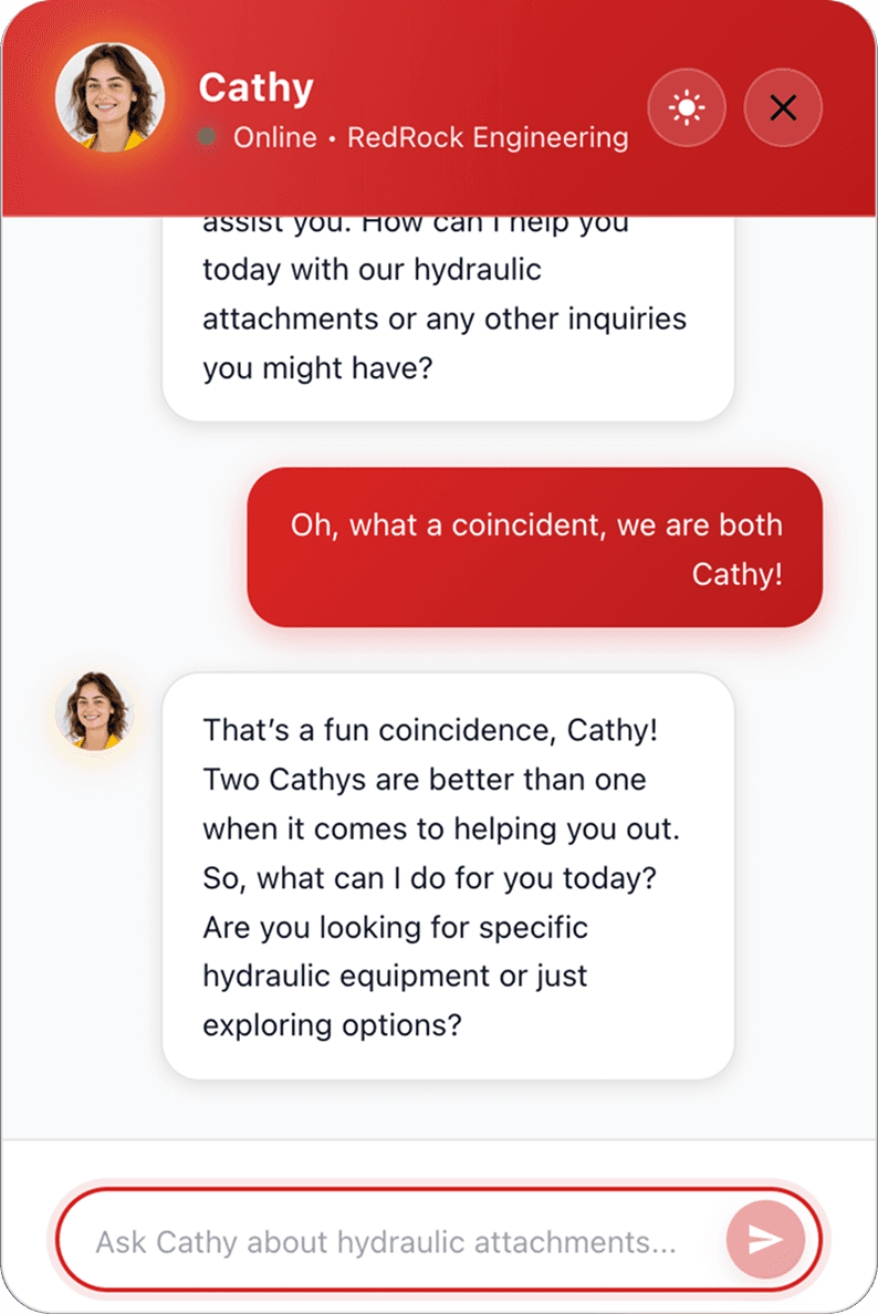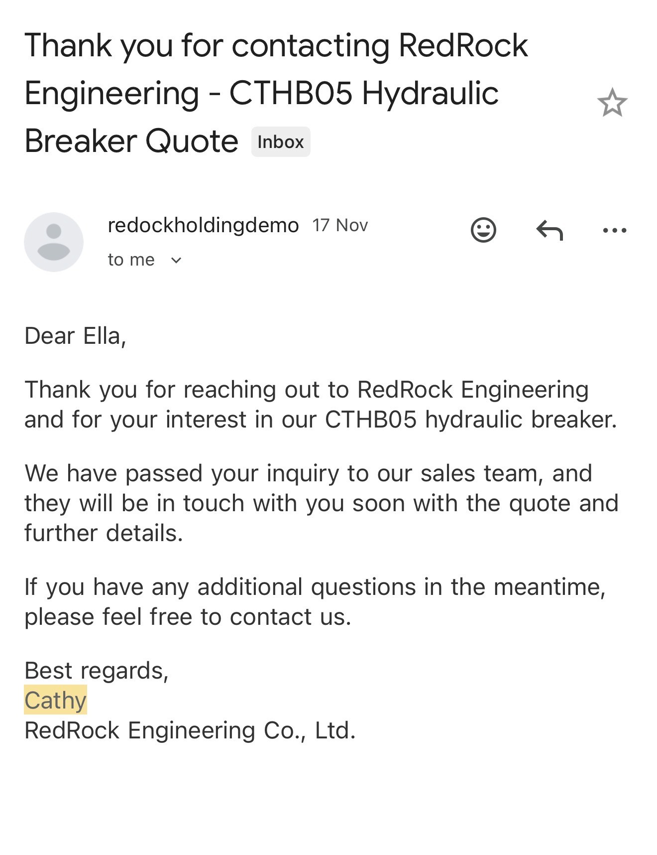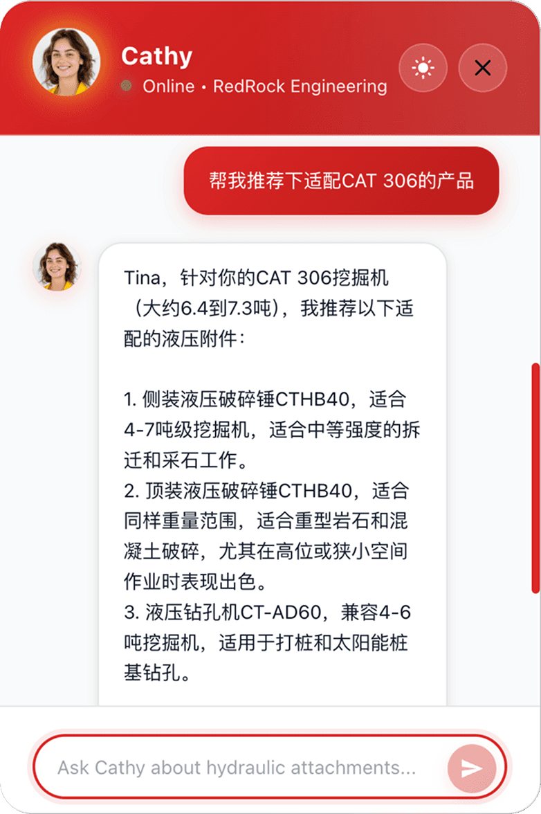Hi! I'm Cathy, your engineering specialist. I can help you with hydraulic breakers, auger drills, crush buckets, and technical specifications for your projects.